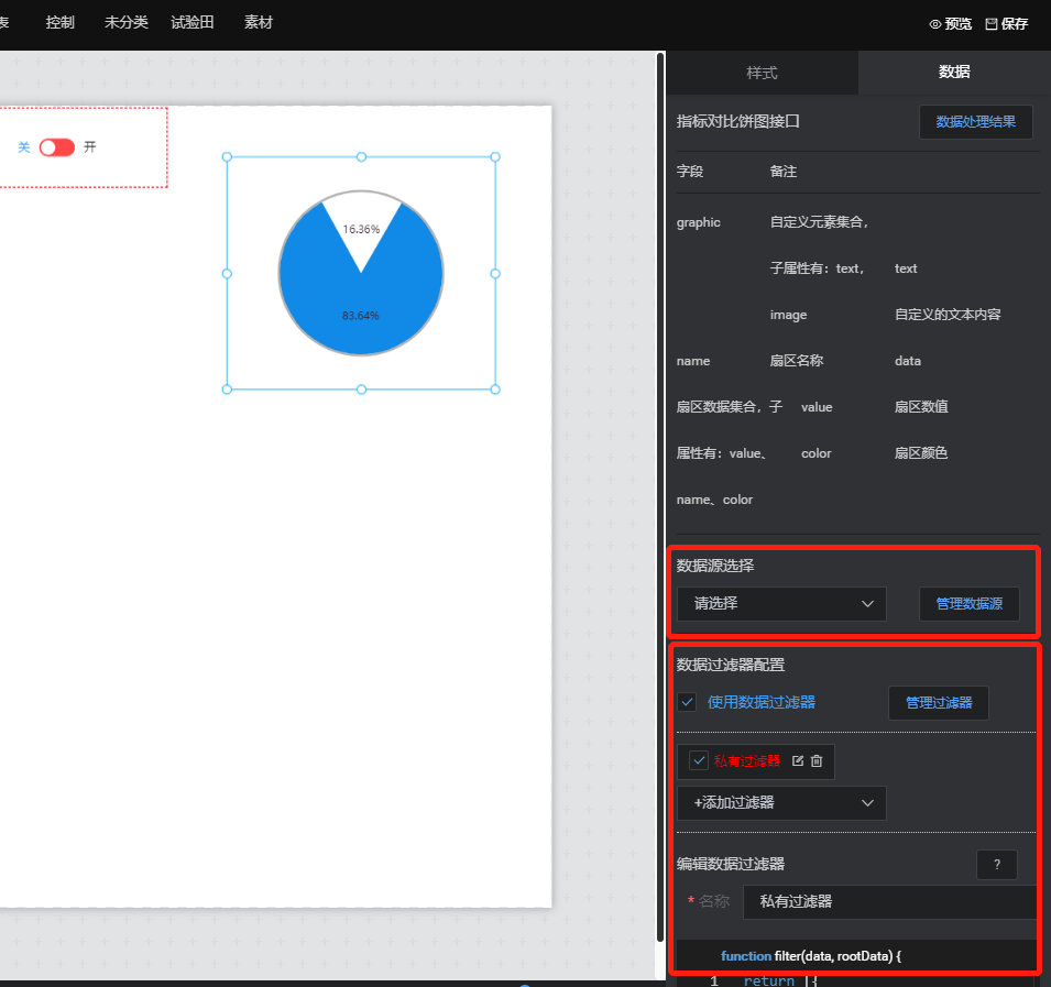 完成组件拖拽后,双击对应组件,点击右侧弹出的【数据】标签即可管理数据源、配置数据过滤器。