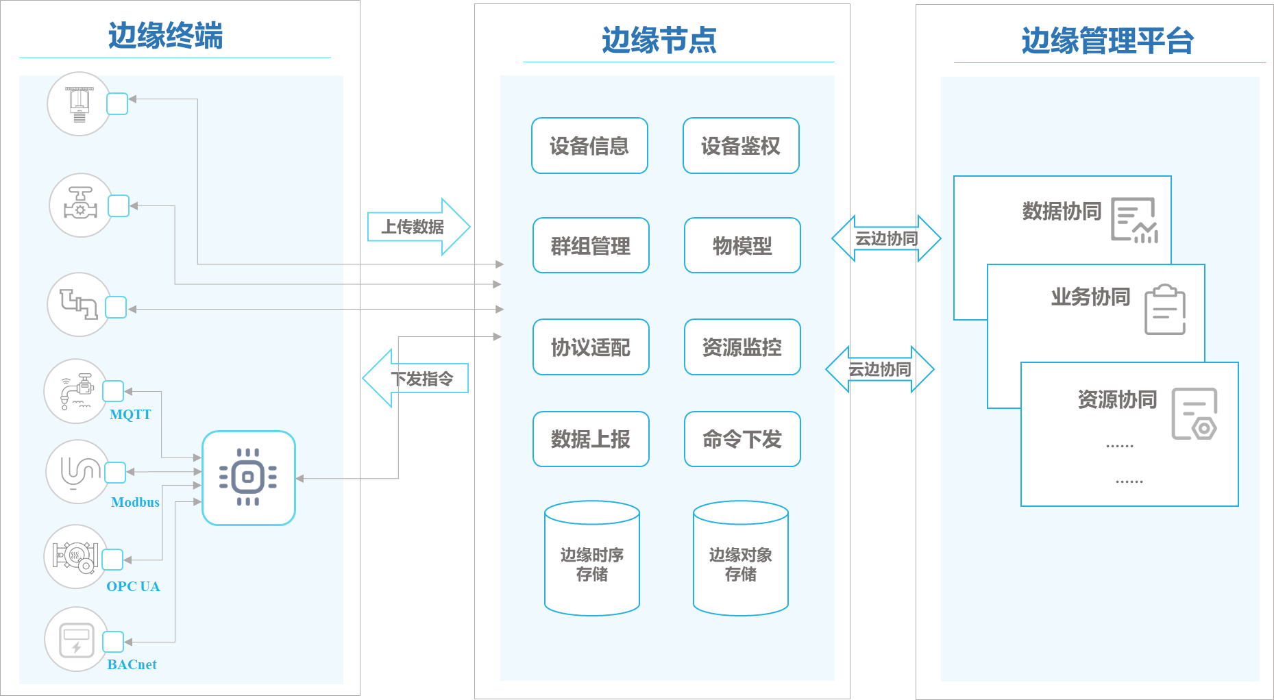 边缘节点支持接入各类工业协议或私有协议终端设备,用户可按照边缘管理平台驱动标准和规范,将开发的自定义协议驱动上传至云端,云端通过云边协同实现驱动应用及相关配置下发至指定边缘节点运行。帮助用户快速实现不同类型、不同通信协议的物联网终端设备接入边缘节点。同时,边缘管理平台原生提供Modbus、OPC-UA、BACnet、MQTT等物联网协议设备接入驱动应用。