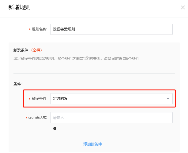 触发条件可以选择设备触发、定时触发(定时触发不支持数据转发)