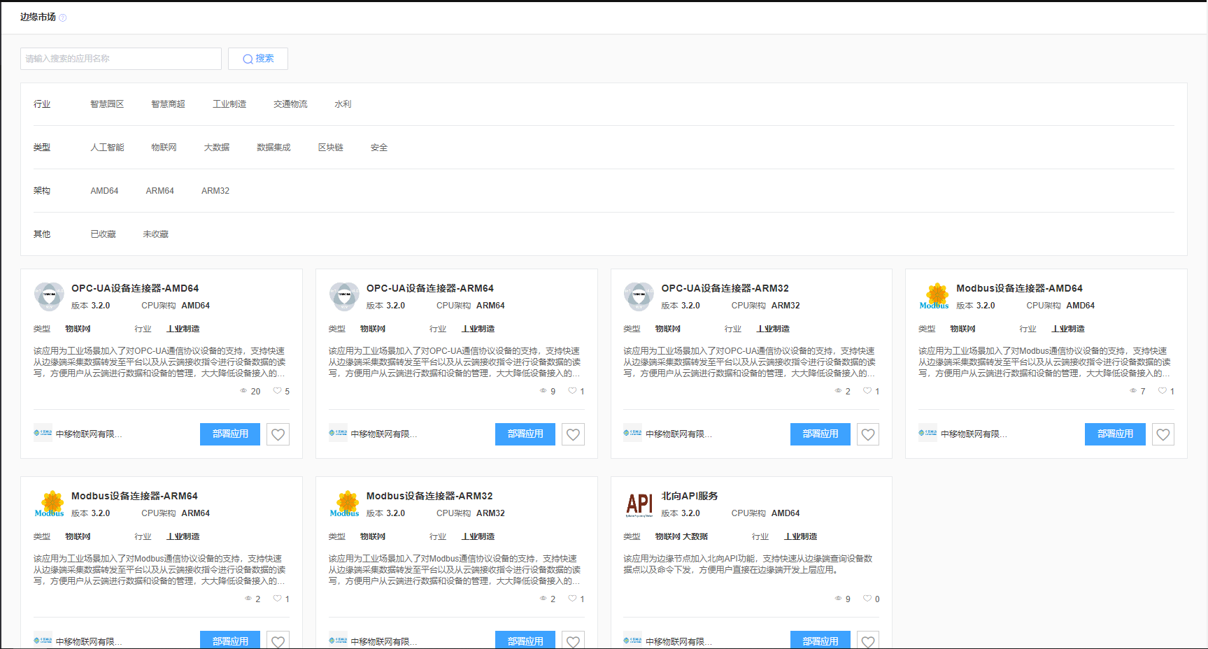 边缘管理平台提供丰富的智能边缘应用,提供MODBUS协议适配应用,OPC UA协议适配应用,流处理、视频分析、文字识别、图像识别等AI模型部署到边缘节点运行,且提供边缘应用和云上服务协同能力。您可以在边缘市场查看应用详情并将应用部署到边缘节点,如果应用详情页中有部署应用按钮,表示该应用当前可以使用。